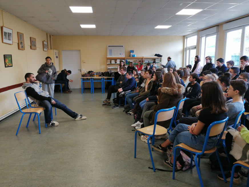 Pour la deuxième année consécutive, le collège a eu la chance de pouvoir bénéficier d’une intervention de la compagnie de théâtre Instant(s) (http://cie-instants.fr/), qui se déplace dans les établissements scolaires pour traiter de thèmes de la société, en présentant trois petites pièces de théâtre forum.