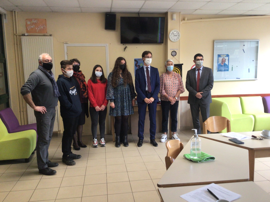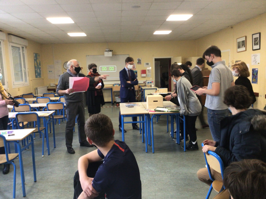 Premier collège de Bretagne à mettre en œuvre un escape game sur la Sécurité Routière, le collège Madame-de-Sévigné a reçu, le 26 novembre 2021, la visite de Mr Arnaud Guinier directeur de cabinet du préfet, de Mr Blanès, DASEN, de Mme Dollé, animatrice des politiques de sécurité routière et de Mme Guérin, directrice du réseau Canopé. Ces personnalités venaient observer nos élèves de 3e, en train de jouer à ce nouveau type de jeu instructif et coopératif.