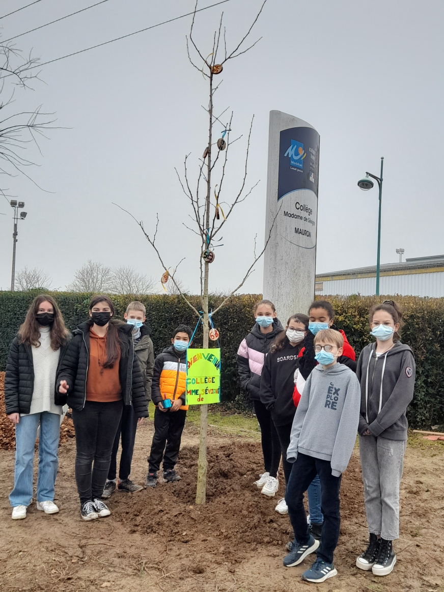 Les éco-délégués du collège Madame-de-Sévigné ont planté avec l’aide des équipes mobiles départementales du Morbihan, un Ginkgo Biloba à l’entrée du collège. Cet arbre appelé également l’arbre aux 40 écus fait partie de la famille des épicéas malgré son feuillage caduc qui prend une magnifique couleur dorée à l’automne. Originaire de Chine, il est très résistant et possède une très grande longévité.