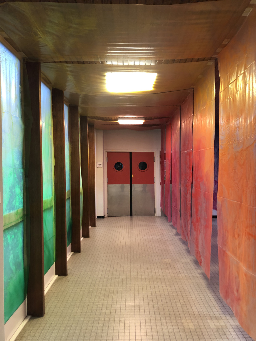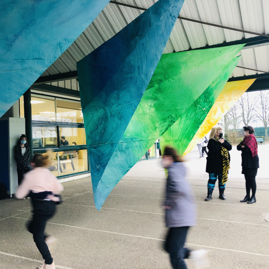 Passage, traversée, volume, paysage, déambulation, expansion de la couleur sont les maîtres-mots des installations co-créées avec les élèves, de leur conception par le dessin à leur réalisation in situ.
