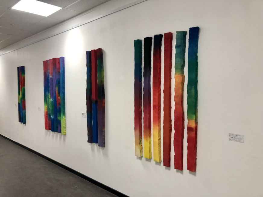 L’artiste investit la galerie d’art à vocation pédagogique avec l’idée de créer un parcours coloré, entre peinture et sculpture, qui s’étend à d’autres espaces du collège. L’occasion aussi, pour les élèves, d’expérimenter la création en investissant tout leur corps, leur énergie, et l’effort parfois physique que l’acte de peindre peut demander.