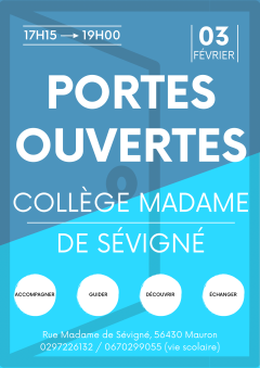 Nous vous attendons le vendredi 03 février entre 17h15 et 19h pour les portes ouvertes du collège Madame de Sévigné à Mauron