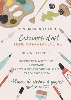 Dénicheur de talents ! Pour cette nouvelle année, le concours d’arts revient sur le thème : Vu par la fenêtre TOUTES les techniques sont autorisées. Cela peut être de la peinture, sculpture, maquette, poterie etc…. Tous les élèves de l’établissement peuvent participer. Les œuvres doivent être anonymes pour le vote. Le gagnant recevra 2 places de cinéma offertes par le FSE