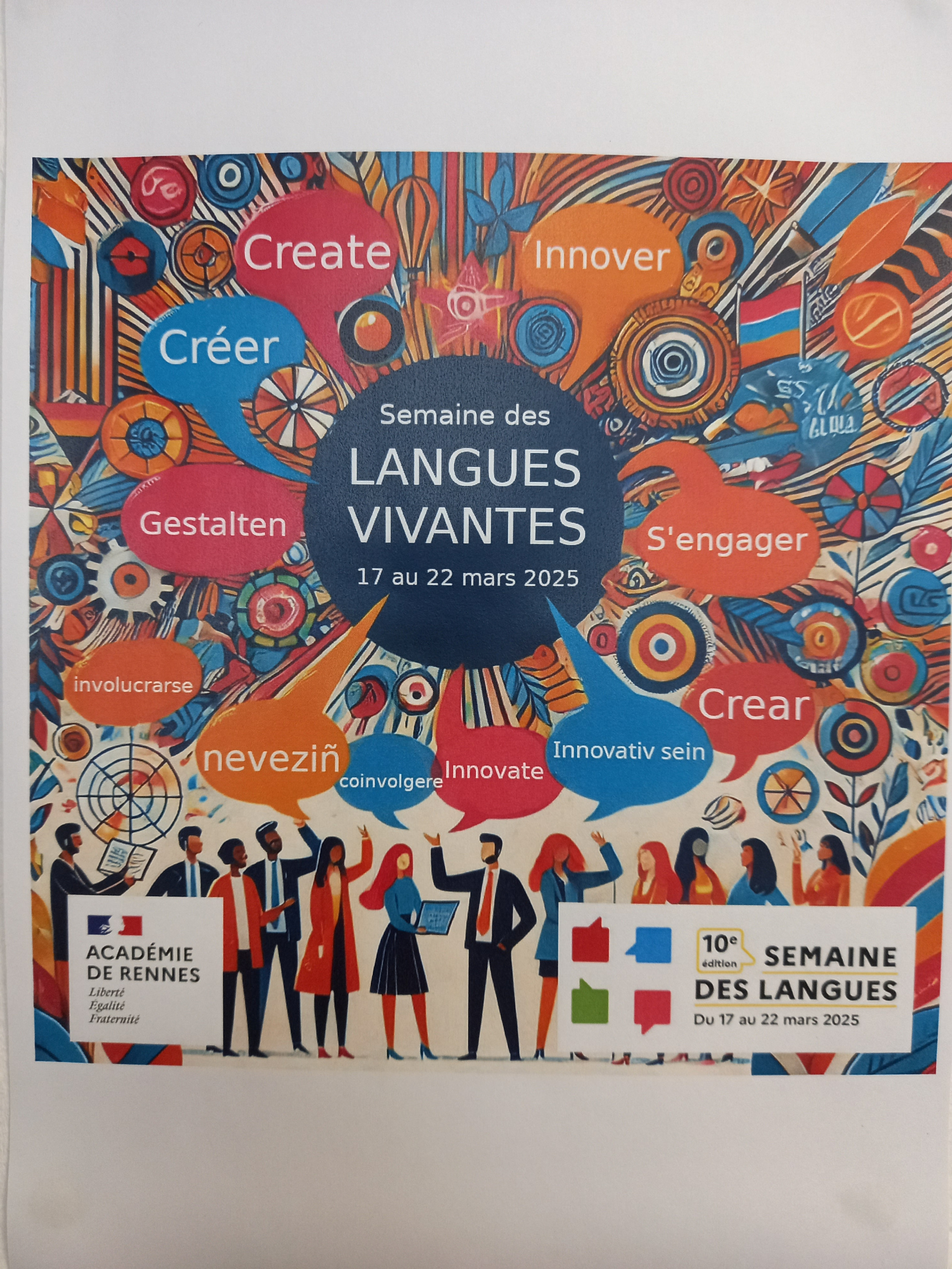 Du 17 au 22 mars, le collège Madame de Sévigné a fêté les langues, la diversité des culture et l’ouverture sur le monde ! Les élèves ont des cultures, origines, des langues diverses et variées : créoles, malgaches, portugaises, espagnoles, bretonnes. Ils ont pu les mettre en valeur dans des bulles accrochées dans la galerie des arts. Pour donner le goût du voyage, une carte du monde a été suspendue en salle de permanence. Chacun était invité à raconter une anecdote de voyage sur un post-it, certaines histoires étaient rocambolesques ! Bien sûr, au self, on s’est régalés entre la délicieuse forêt noire du repas allemand et la tortilla du repas espagnol. Pour finir, certains élèves ont eu la chance de participer à une présentation/initiation à la langue des signes. A l’année prochaine !