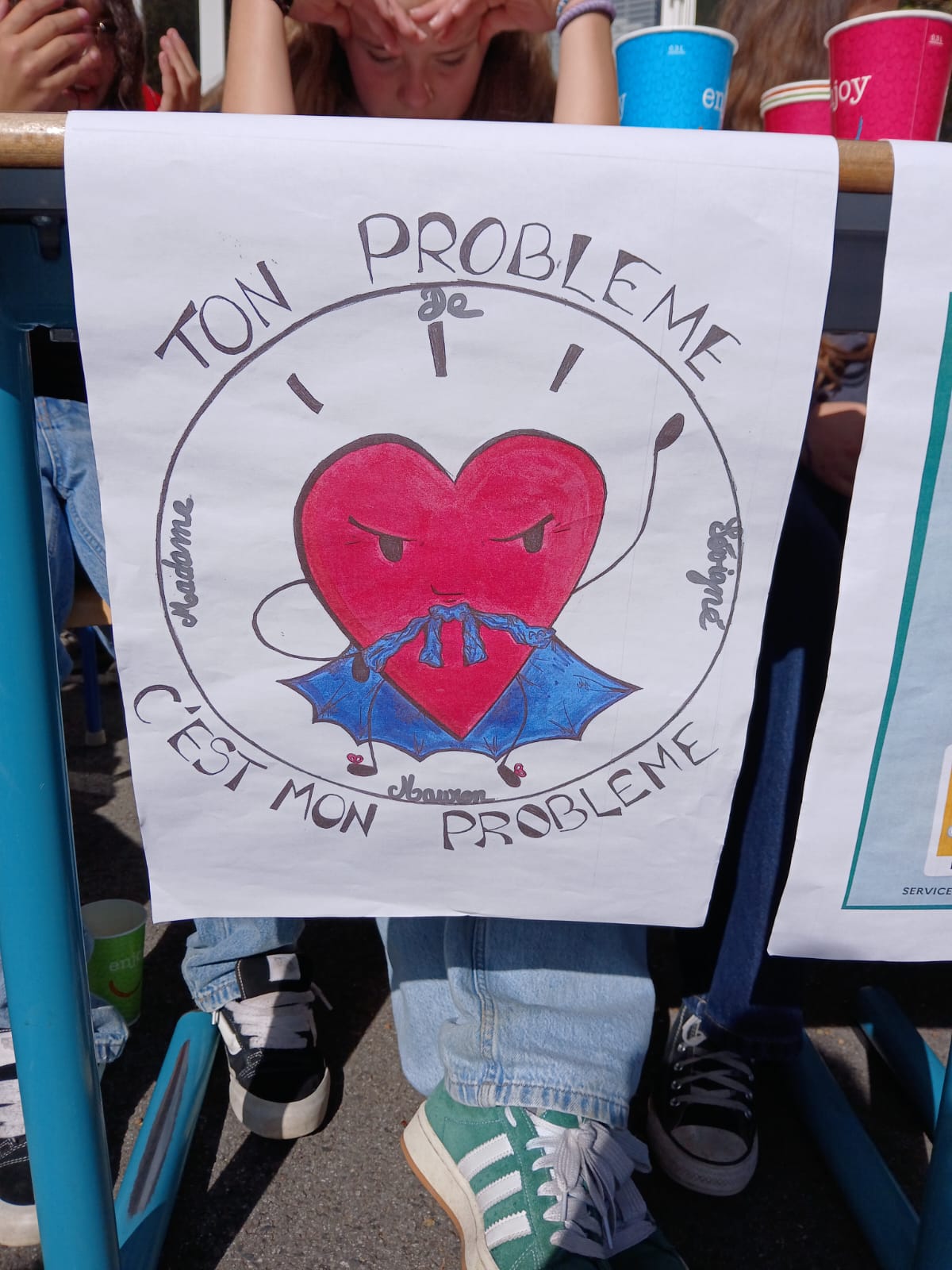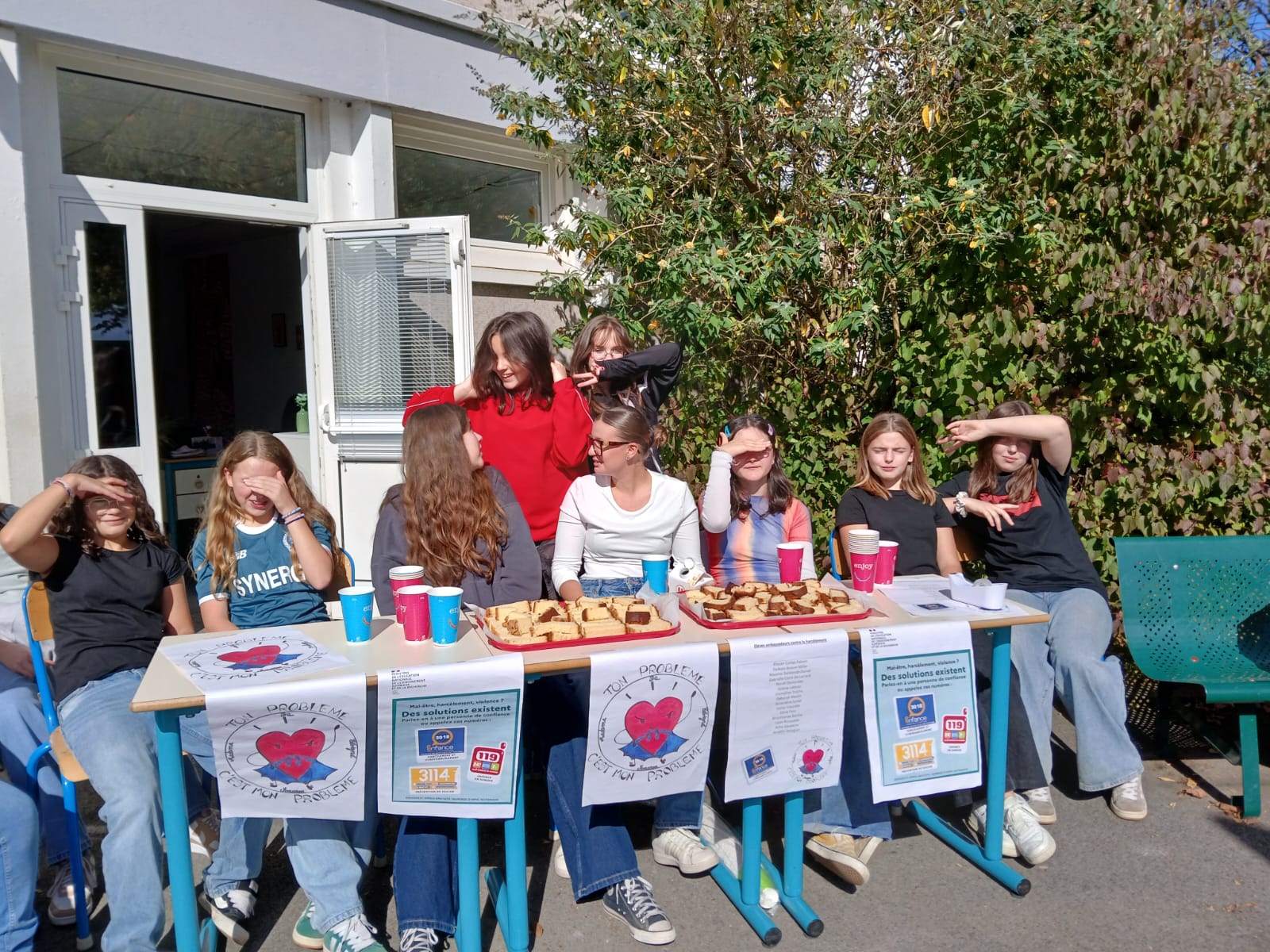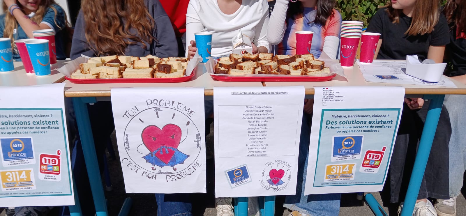 Journée contre le harcèlement aujourd’hui, lundi 6 octobre 2025 au collège Madame De Sévigné. Les 15 élèves Ambassadeurs contre le harcèlement tiennent un stand « ton problème est mon problème » pendant la pause méridienne. Ils répondent et renseignent leurs camarades sur les problèmes de harcèlement. Les ambassadeurs ont suivi une formation l’an dernier et participeront à divers ateliers avec entre autre les promeneurs du net, cette année.
