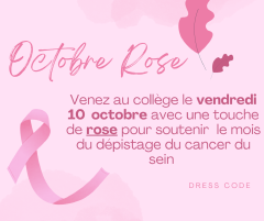 Pour marquer notre engagement, tous les élèves et personnels du collège sont invités à porter un vêtement ou un accessoire rose le vendredi 10 octobre.
