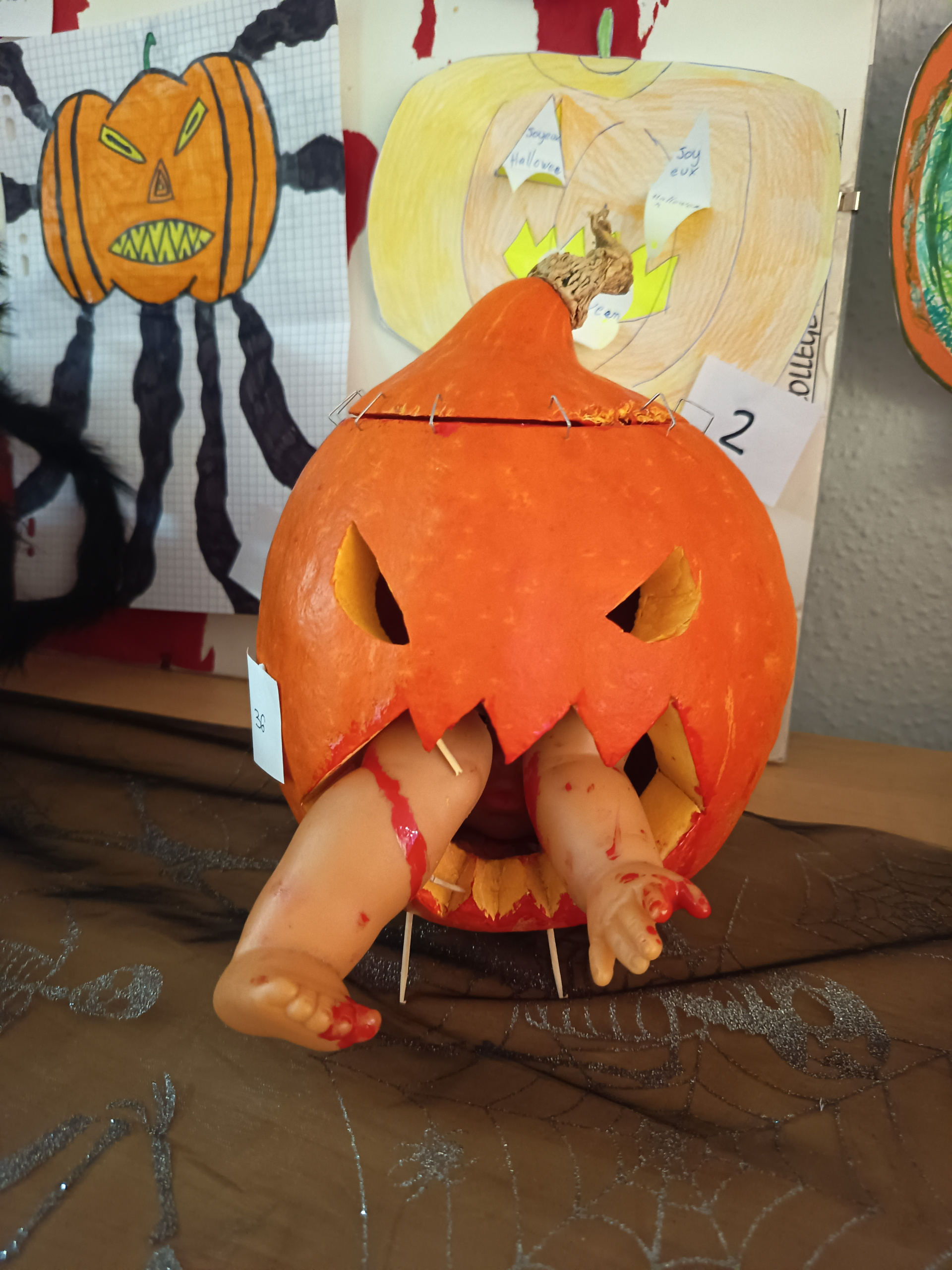 🎃 3e place : Maxime, dont la citrouille a failli ensorceler le jury ! 👻 2e place : Zael, qui a réussi à faire frissonner même les fantômes du collège. 🕸️ 1re place : Livio, dont la citrouille était si effrayante qu’on a cru voir des chauves-souris tourner autour !