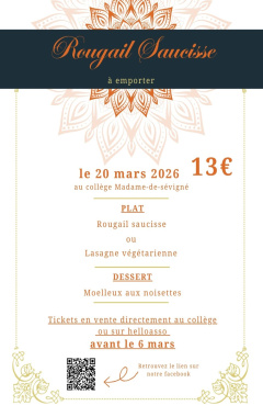 Les élèves volontaires disposent de carnets pour vendre les tickets. Vous pouvez également passer commande directement en ligne via le lien suivant : https://www.helloasso.com/associations/foyer-socio-educatif-du-college-nationalise-de-mauron/boutiques/vente-a-emporter-rougail-saucisse-ou-lasagnes-vegetariennes